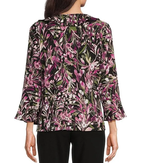 Riley Woven Floral Sprigs Cascading Ruffled V-Neck 3/4 Sleeve Top