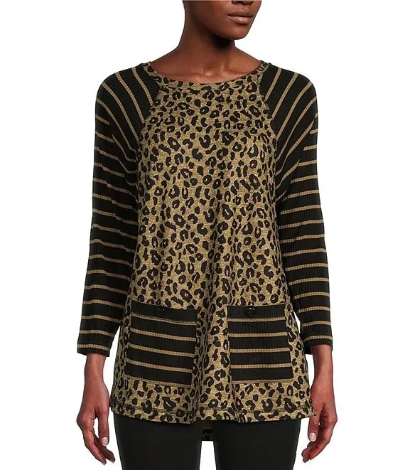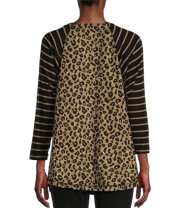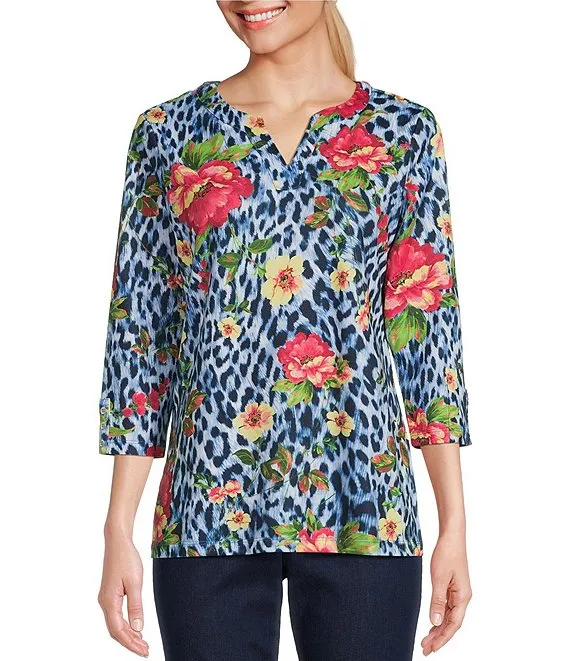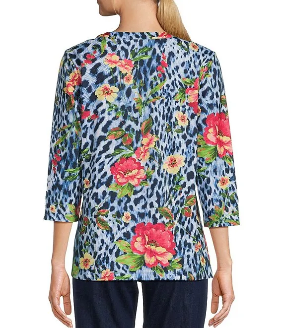 Embellished Cheetah Floral Print 3/4 Sleeve Split V-Neck Knit Top