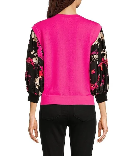 Knit Satin Mixed Media Crew Neck Print 3/4 Sleeve Blouse