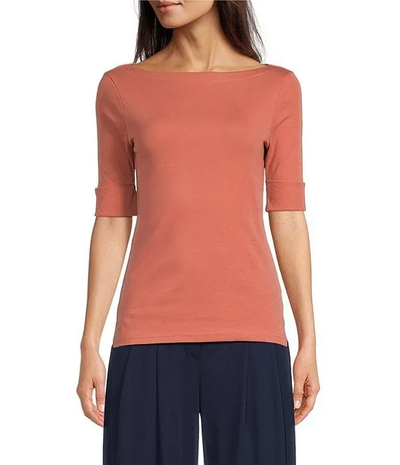 Lauren Ralph Lauren Stretch Cotton Blend Boat Neck Short Rolled Sleeve Shirt