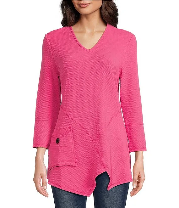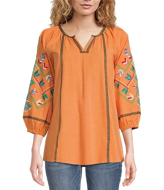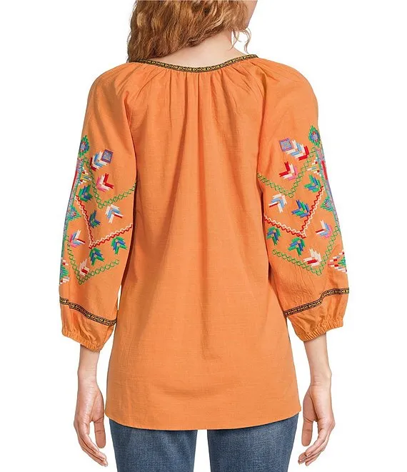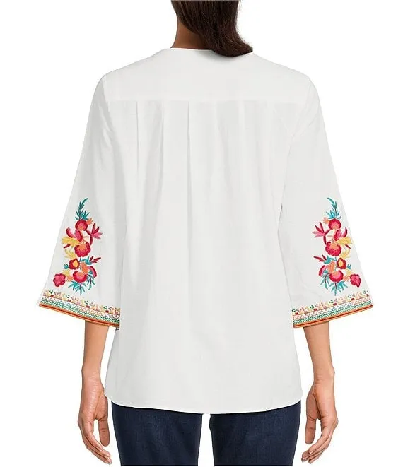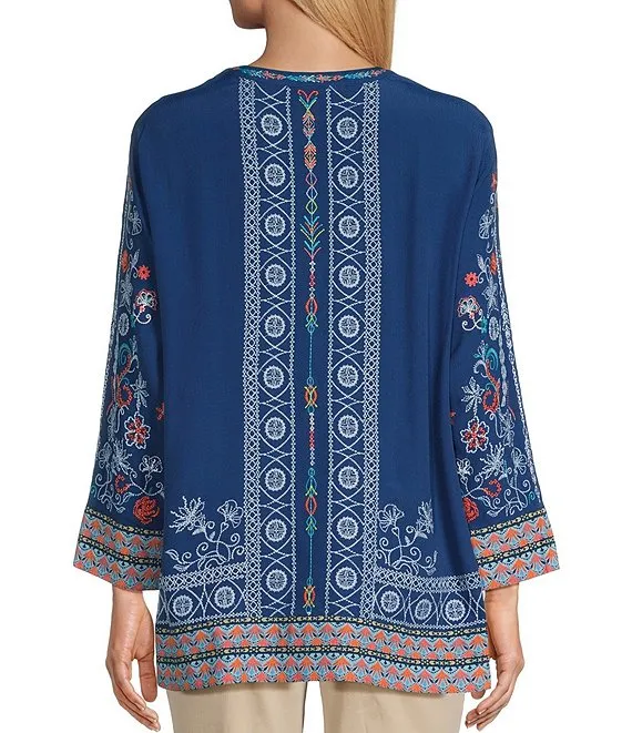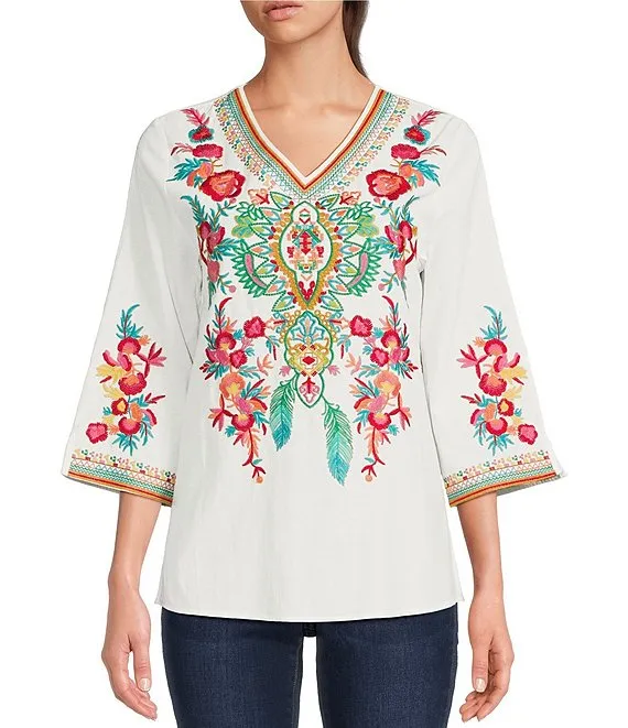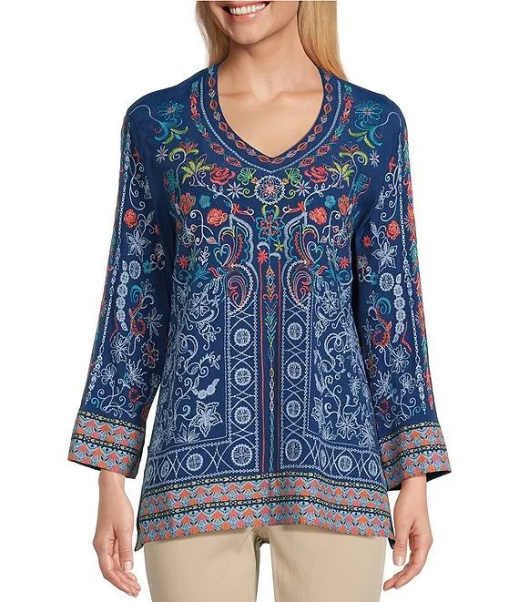 Woven All Over Embroidered Floral Print V-Neck 3/4 Sleeve Tunic