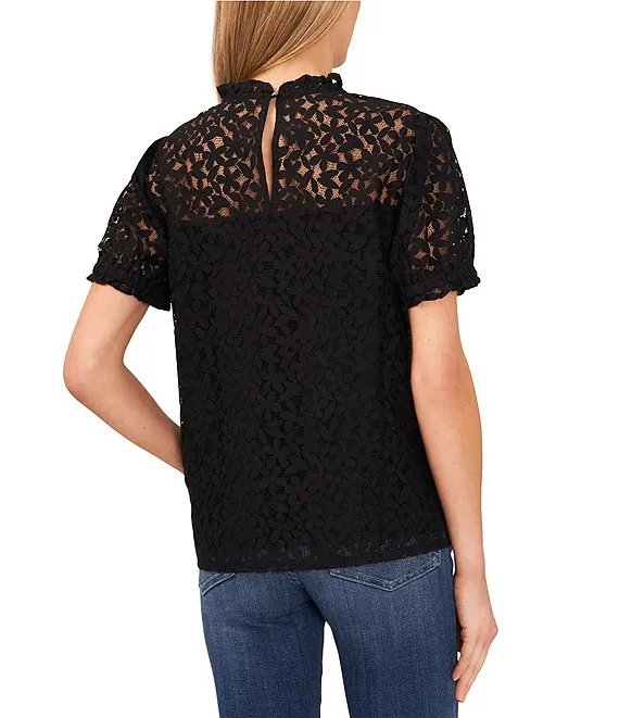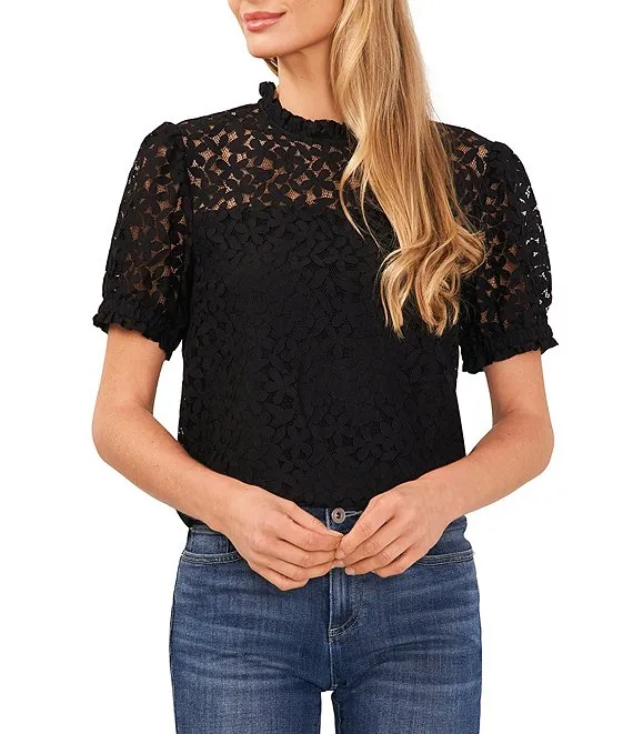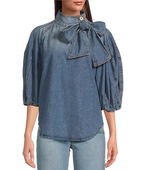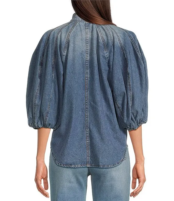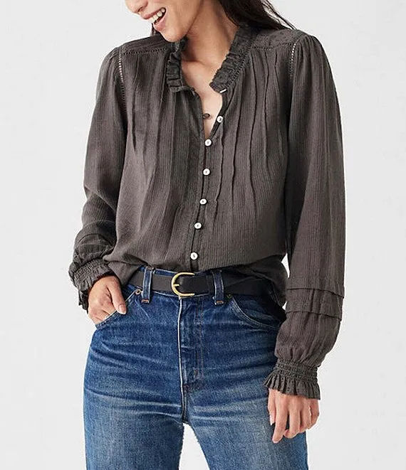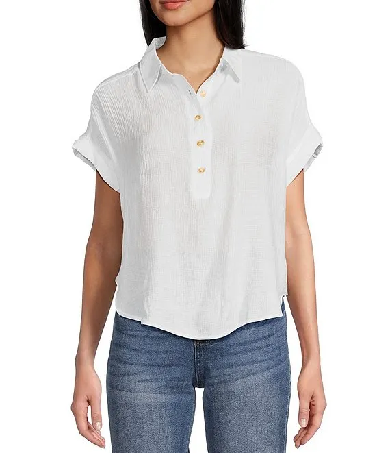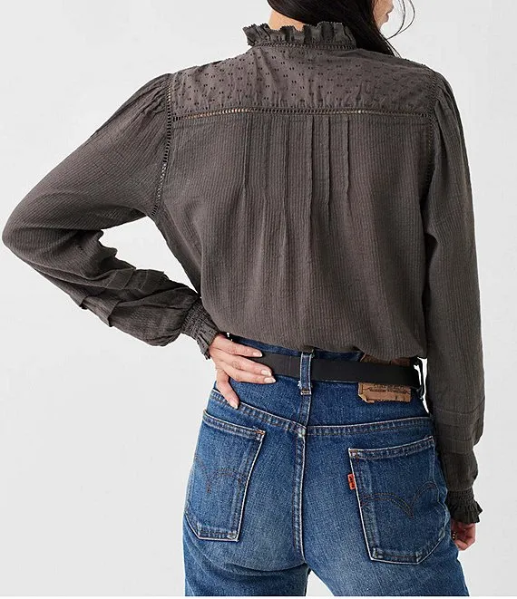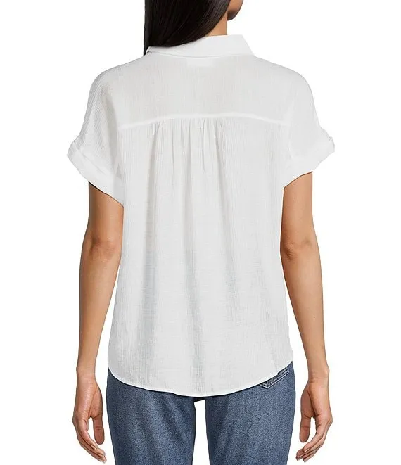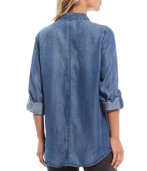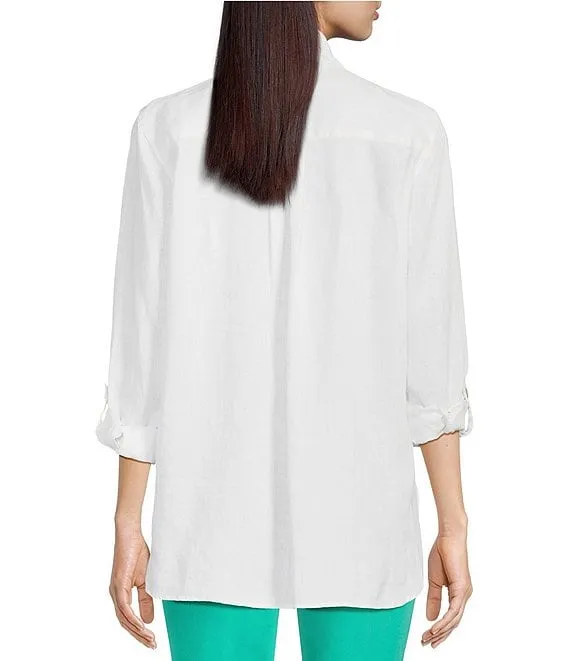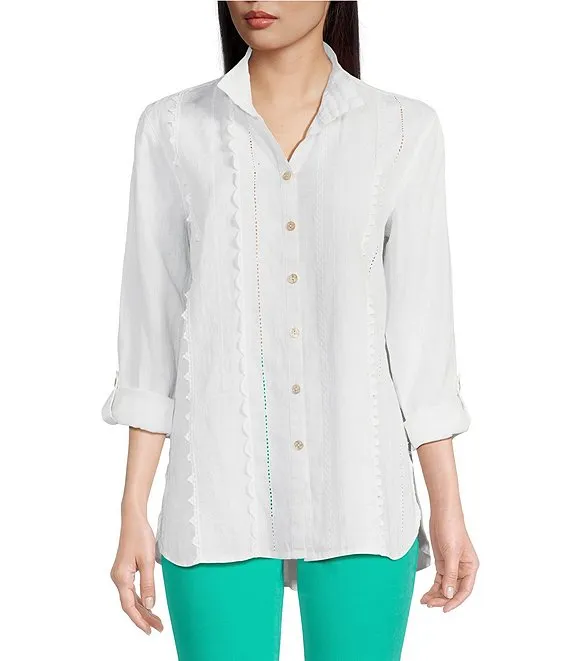 Woven Embroidered Point Collar Long Roll-Tab Sleeve Mix Trim Button Front Tunic
