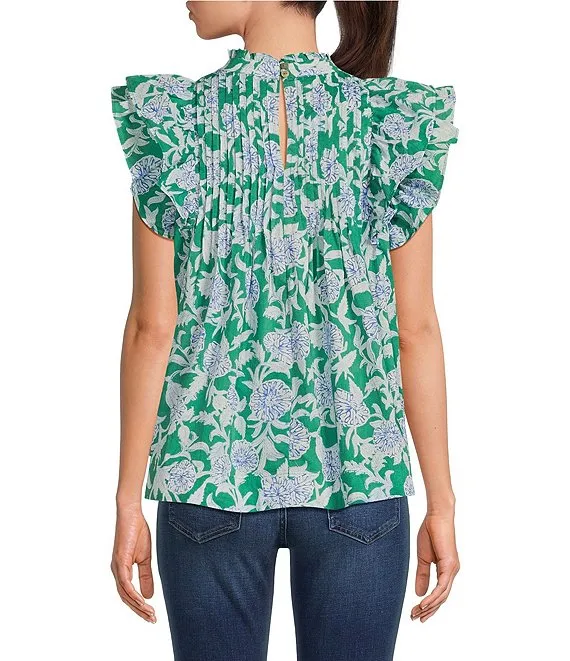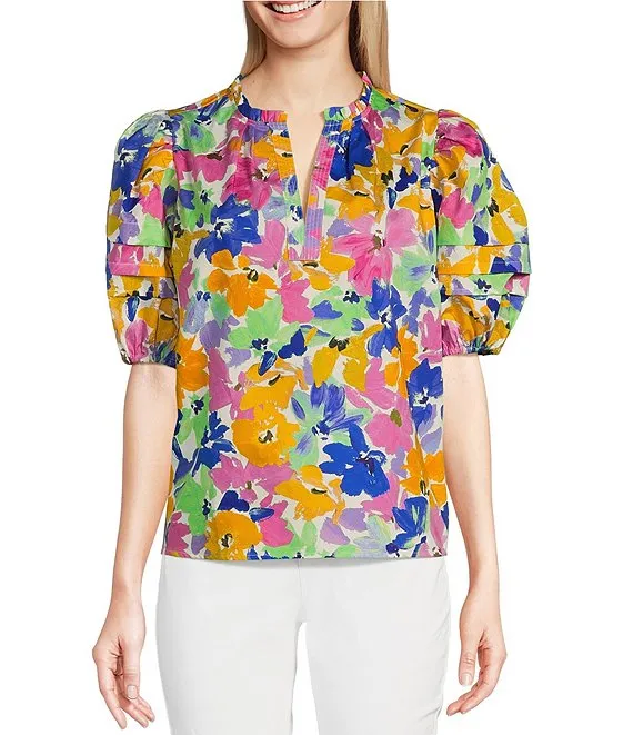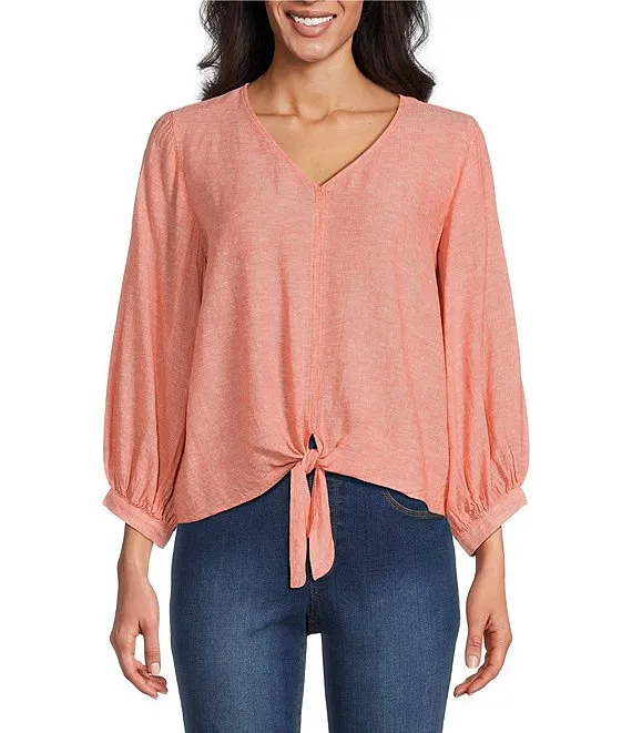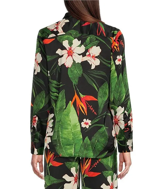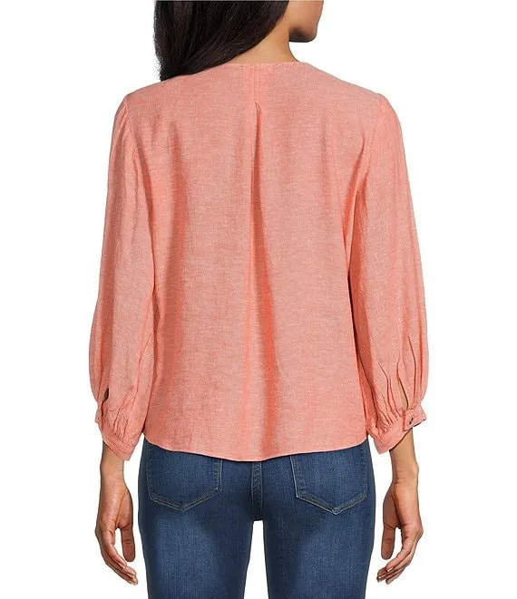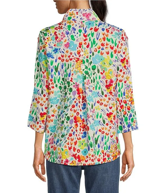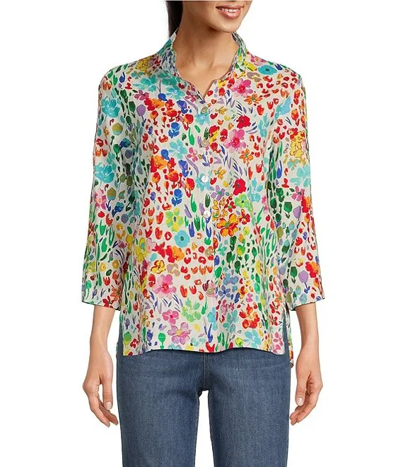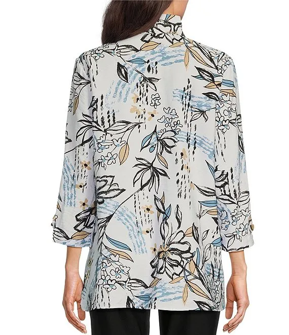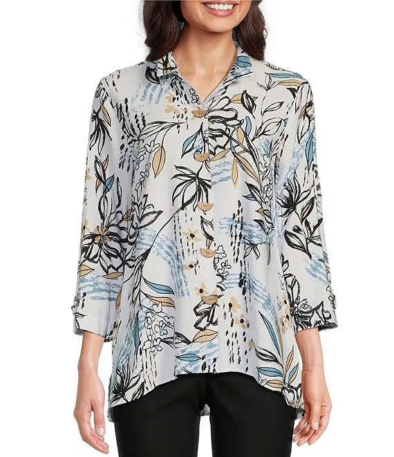 Allover Floral Print Linen 3/4 Sleeve Button-Front Hi-Low Tunic
