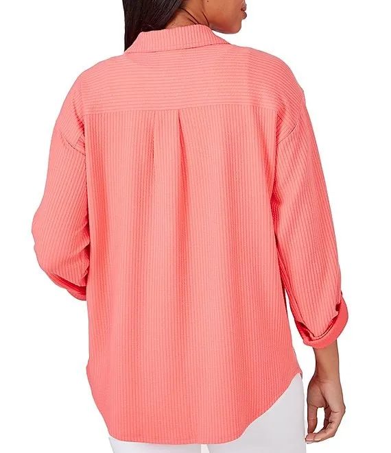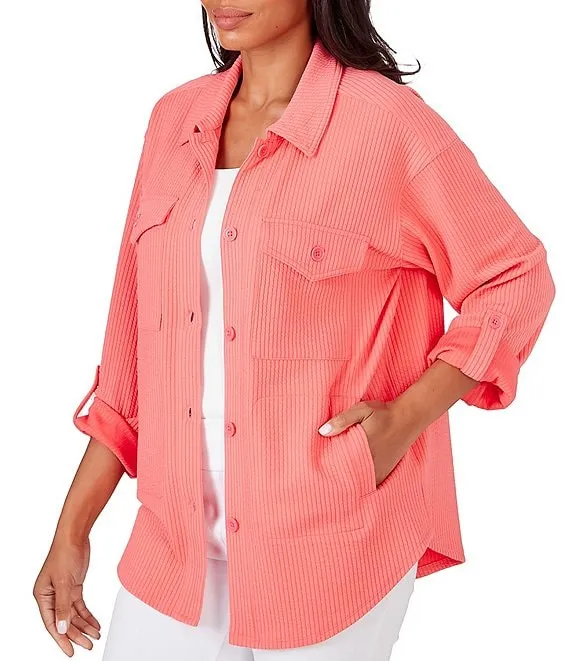 Petite Stripe Ottoman Knit Point Collar Roll-Tab Sleeve Patch Pocket Button-Front Shirt Jacket