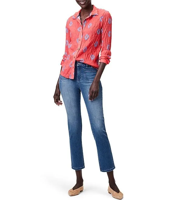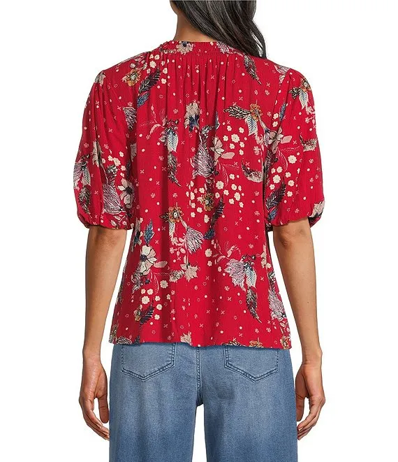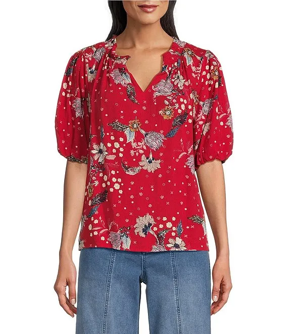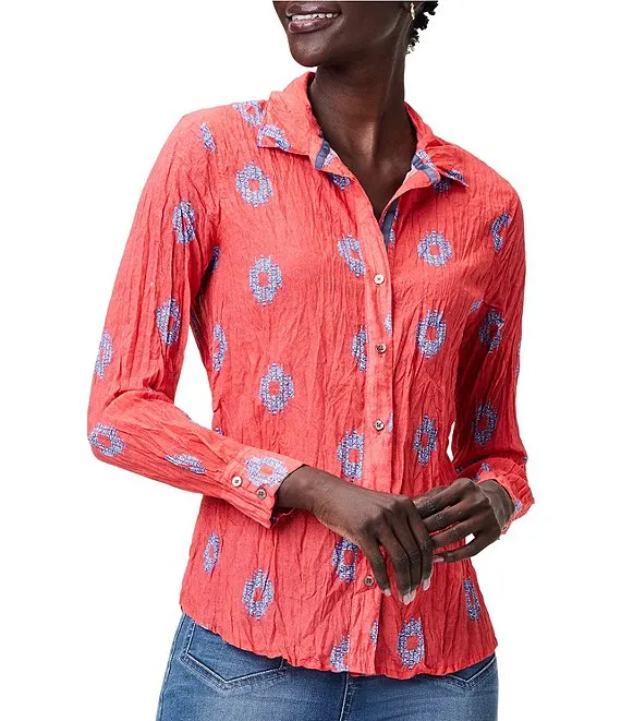Embroidered Crinkled Floral Print Split-V Neck Long Sleeve Tunic