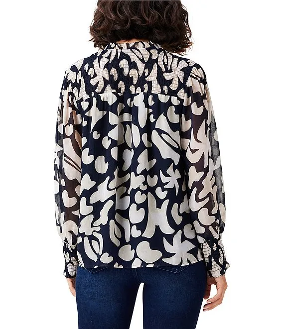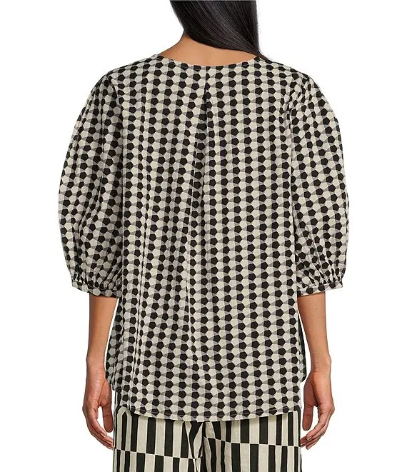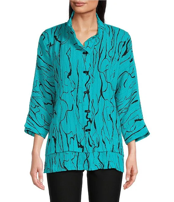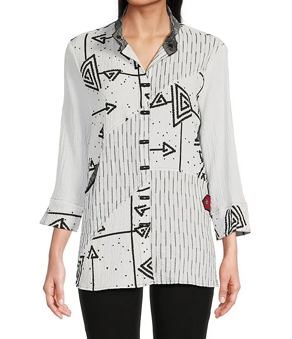 Line Abstract Print Woven Wire Collar 3/4 Sleeve Button-Front Tunic
