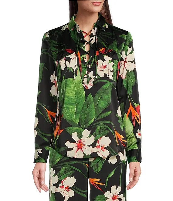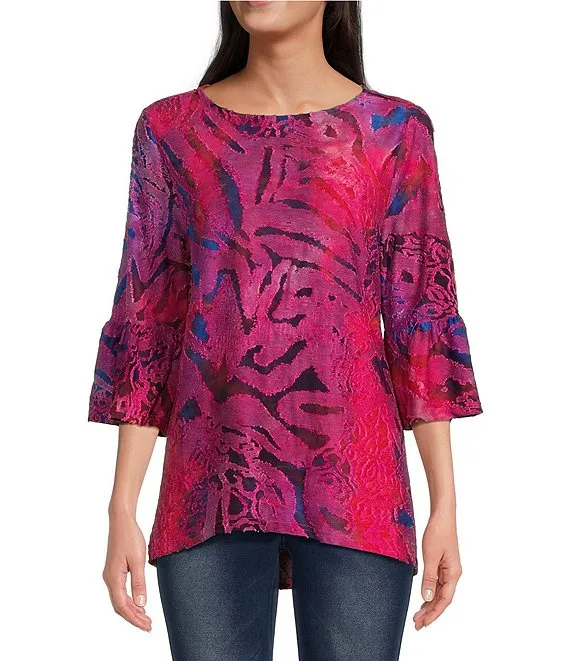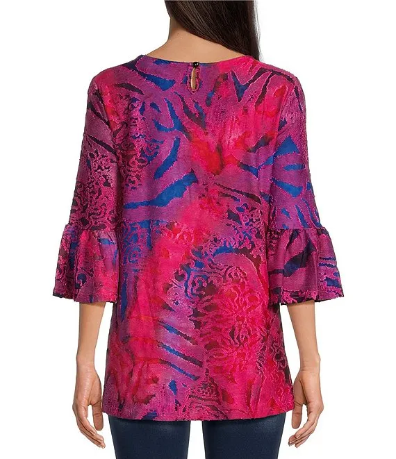 Silky Twill Lotus Floral Print Scoop Neck 3/4 Bell Sleeve Tunic