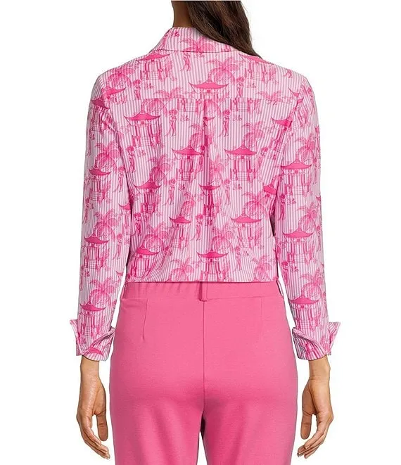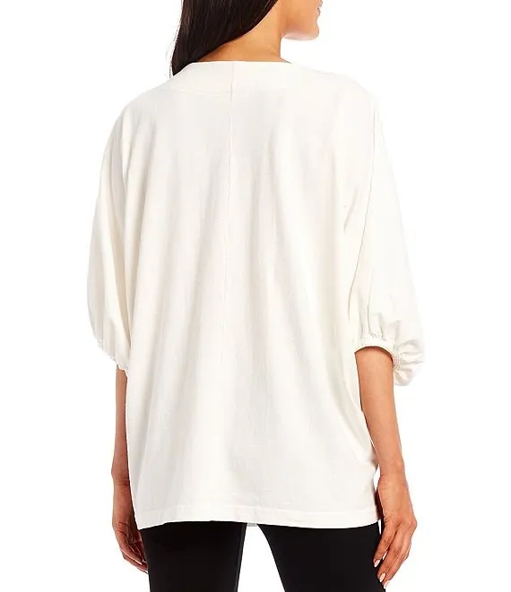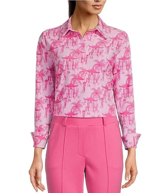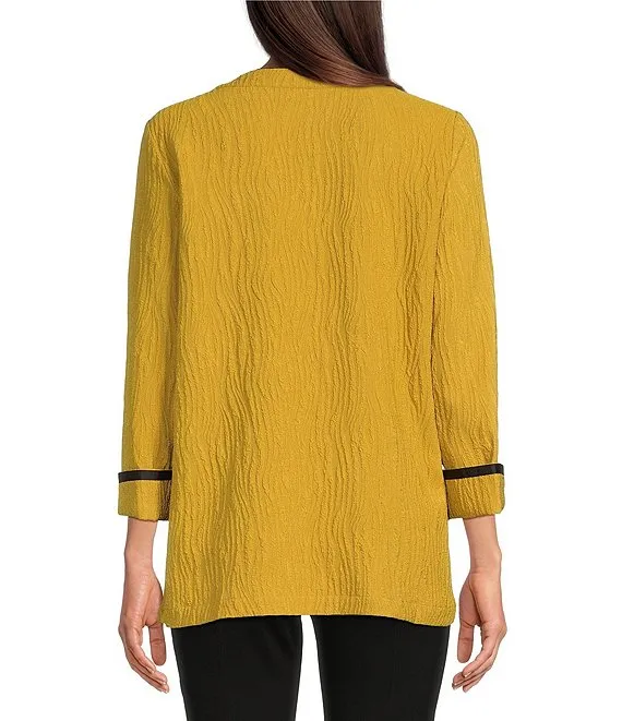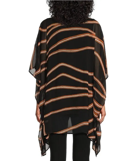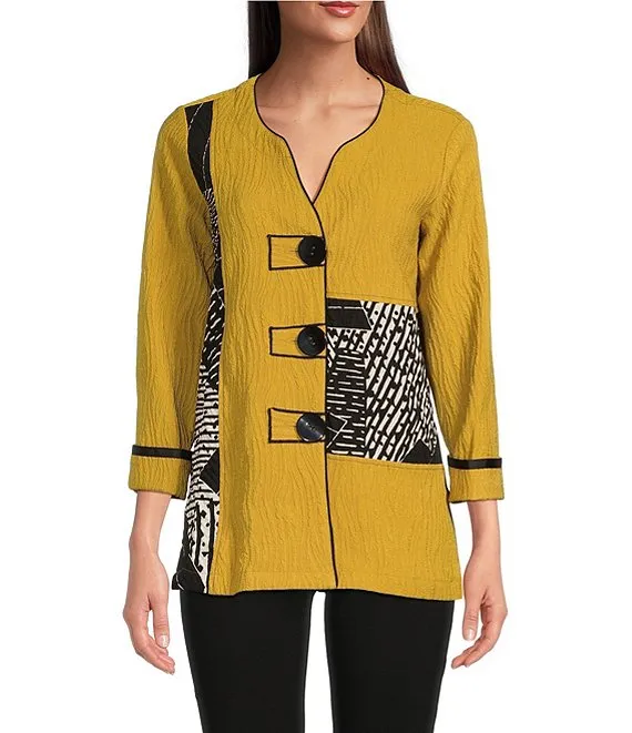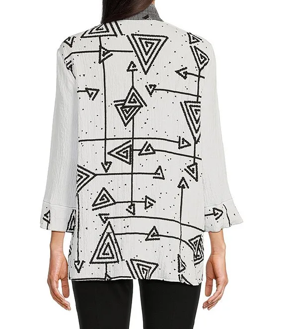 Mixed-Media Stripe & Abstract Wire Collar 3/4 Sleeve Button-Front Tunic