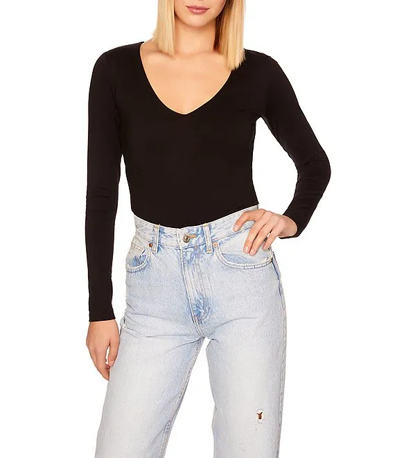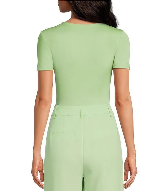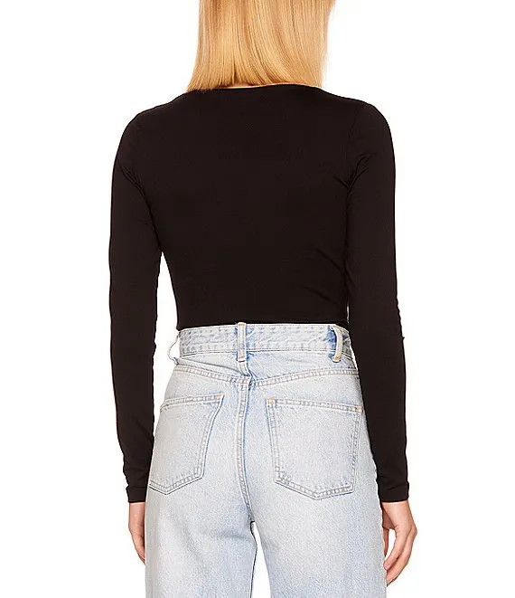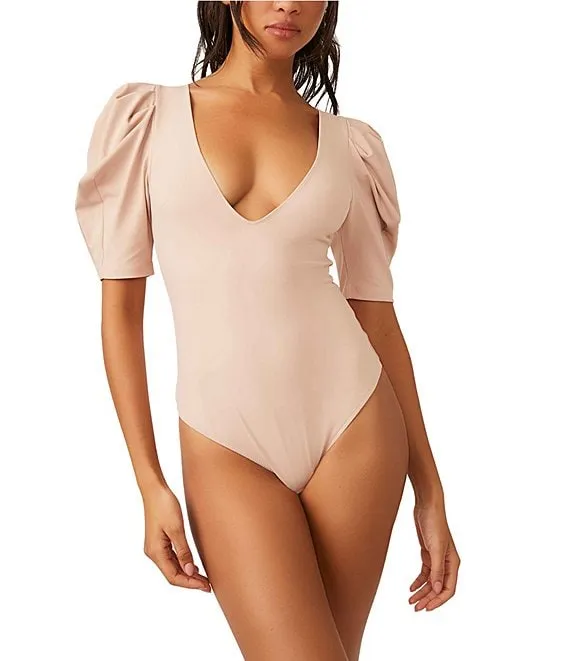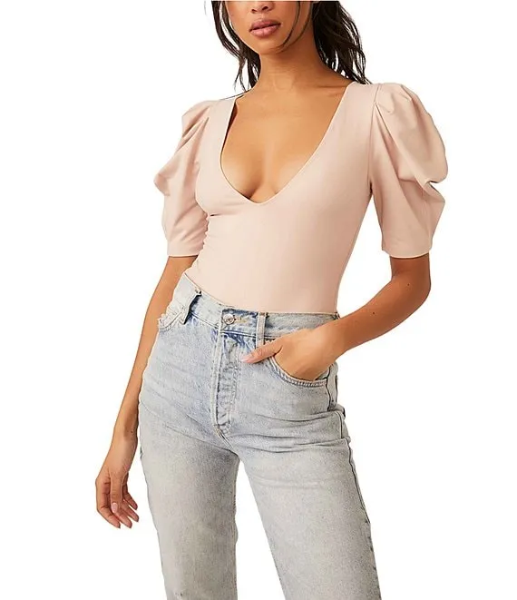 Va Va Voop Knit Deep V-Neck Short Ruched Puffed Sleeve Bodysuit
