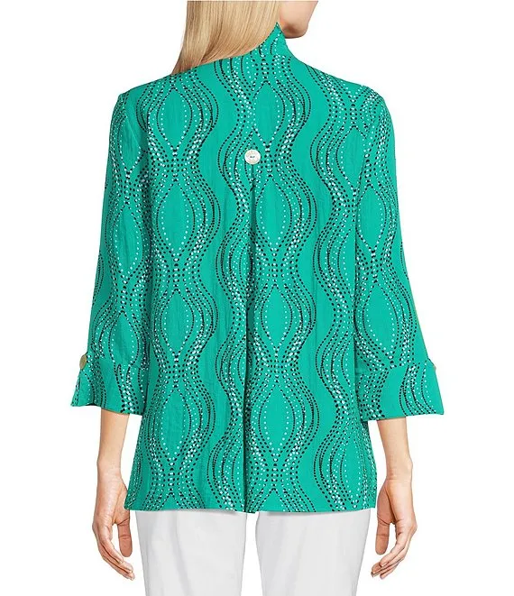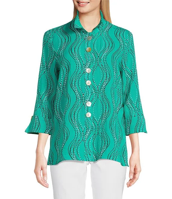Wavy Dotted Wavy Lines Print Wire Collar 3/4 Cuffed Sleeve Button-Front Shirt