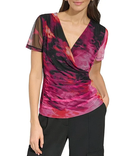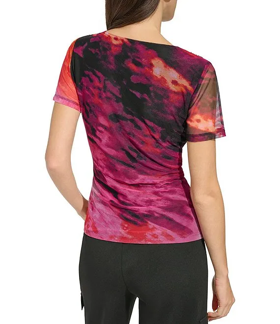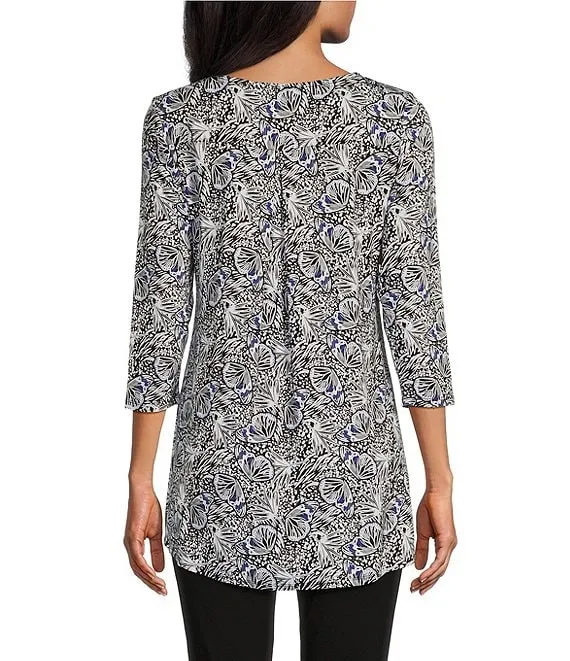 Butterfly Print Scoop Neck 3/4 Sleeve Pleated Back High-Low Hem Legging Tee Shirt