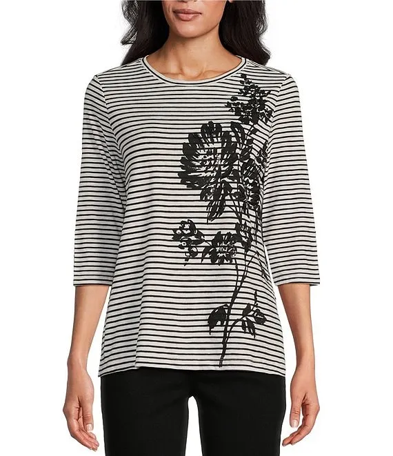 Stripe Floral Placement Print Round Neck 3/4 Sleeve Top