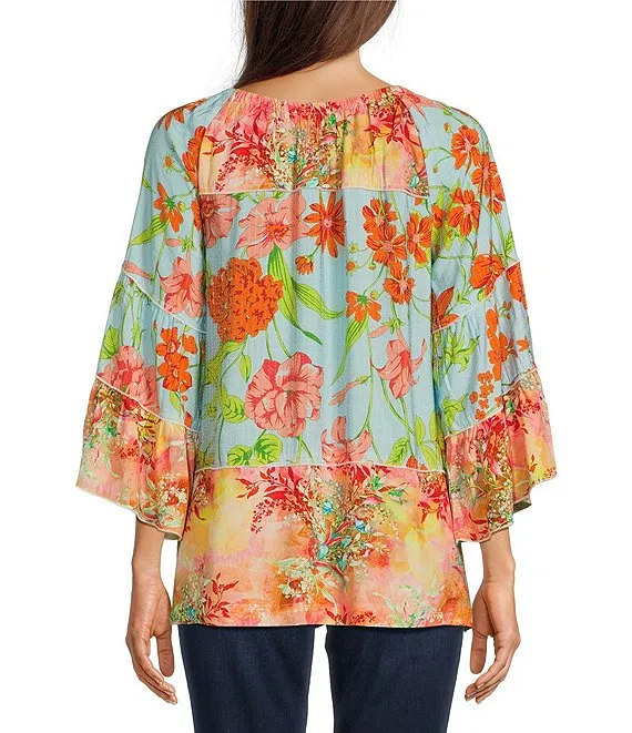 Patchwork Floral Print Scoop Neck 3/4 Sleeve Tunic