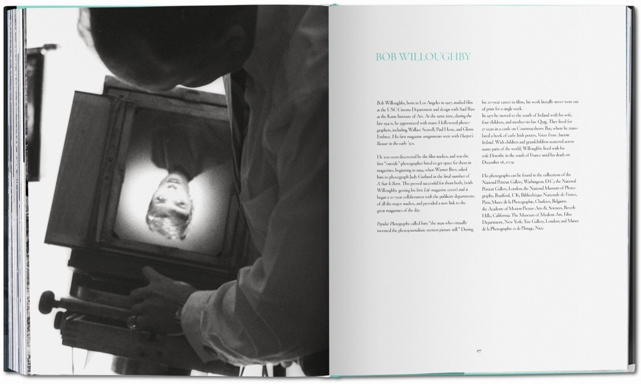 Bob Willoughby (1927-2009) took his first photo at the age of twelve. By 1954 his exhibitions of photographs of jazz musicians and dancers led to a contract with Globe Photos, followed by work at Harper's Bazaar. After shooting Judy Garland during the filming of A Star is Born he became the first "unit photographer"—hired specifically by movie studios to take on-set promotional "stills". The author of numerous books on photography, he lived his last years in Vence, France.