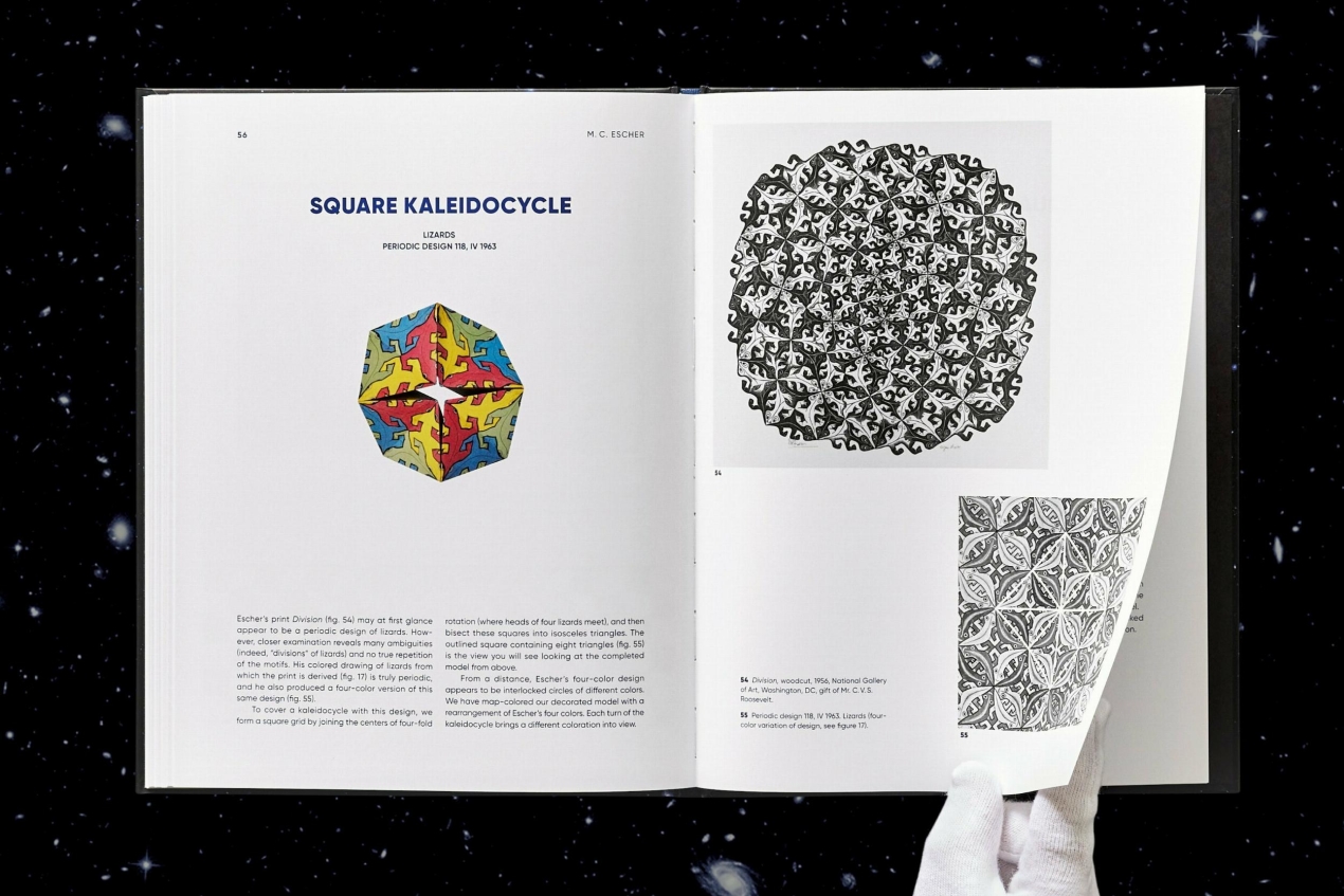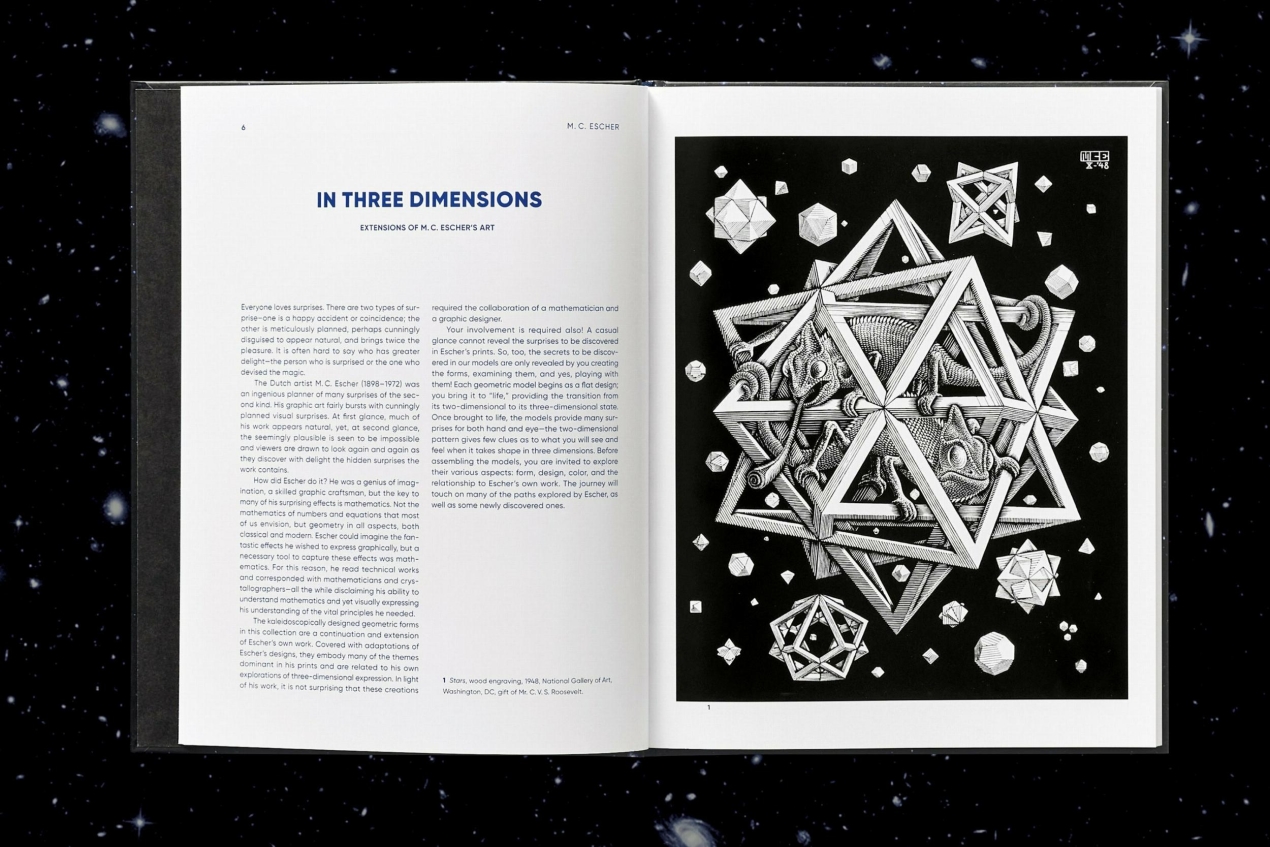 This set puts Escher’s tessellated wonders right at your fingertips with 17 easy-to-assemble paper sculptures. Folding along the score lines, you can transform the artist’s richly geometric designs into three-dimensional polyhedra with forming and reforming patterns, including genius arrangements of flowers, butterflies, lizards, and seashells. The book includes a review of the geometric principles and artistic invention underlying Escher’s optical marvels as well as concise instructions.