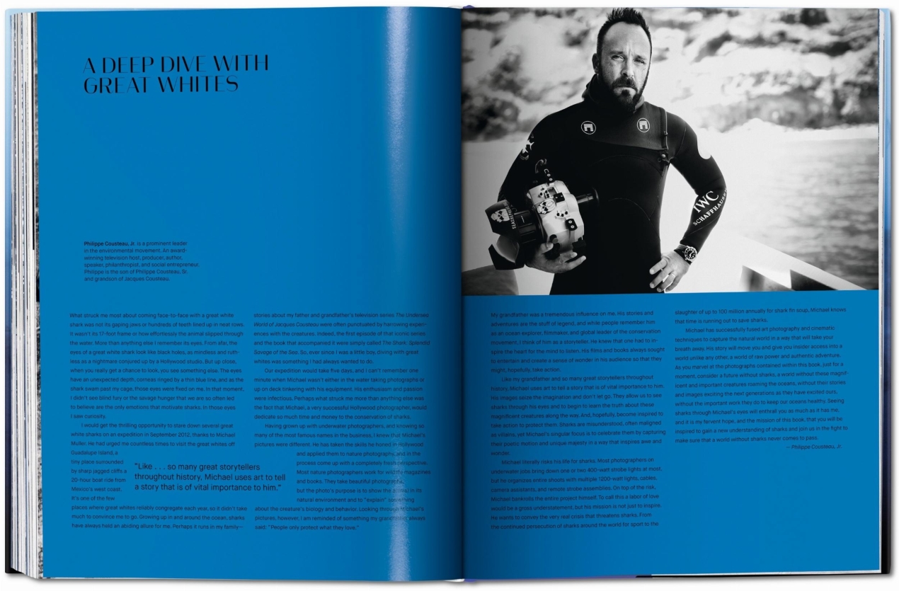 To compliment Muller’s work for advocacy organizations such as WildAid and EarthEcho, the images are contextualized with essays from Philippe Cousteau, Jr. and marine biologist Alison Kock, who discuss exploration and conservation of our oceanic kingdom. Culture writer Arty Nelson adds an overview of Muller’s work, while a technical section explains the precise equipment behind these spectacular shots. Together, these insightful texts and awesome images offer a record of breathtaking photographic feats, a tribute to the beauty and might of the shark, and a rallying cry for its fragile future.
